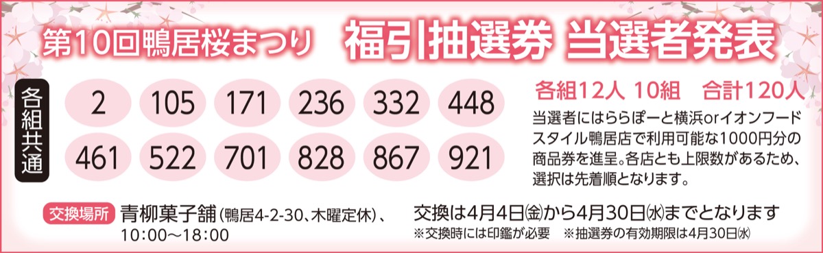 鴨居商栄会の串田賢司会長は「太陽と桜に恵まれ、盛大に開催することができたのは、多くの皆さまの協力によるもの。感謝とお礼を申しあげたい」と話した。鴨居連合自治会の木村赳会長は「過去最高の人出で驚きました。29日から30日に延期して大正解。皆さんに喜んでいただけて良かった」と語った。