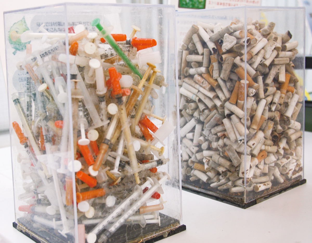 また、公益財団法人 かながわ海岸美化財団が所有する海岸ごみの実物も展示。県内の海岸で回収された無数の注射器やたばこの吸い殻が透明な筒にぎっしりと詰め込まれており、来館者の注目を集めている。