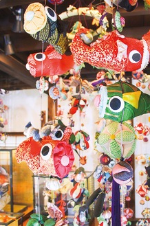 部屋の中には、大きな目のこいのぼりなど、色とりどりのつるし飾り。にいはる里山交流センターの職員によると、これらは区内で活動しているボランティア団体「布クラフト部会」のメンバーが、さまざまな生地を活用して制作したものだという。