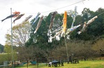 自然に囲まれた広場の上空に、風を受けながら揺れるこいのぼり。こちらも5月20日まで楽しめるという。
