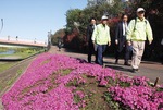 4月15日には緑区の佐藤康博区長、村上一徳副区長らが現地を視察に訪れた。佐々木代表らの案内でシバザクラのほか、会員が鴨居駅と鴨池橋の間にある花壇に「KAMOI L♡VE(ラブ)」の形に植えたビオラの花、同会が今年、鴨池大橋付近の河川敷の一角を整備してつくった「寄り洲」なども見て回った。