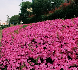 鶴見川に架かる鴨池橋周辺の堤防に植栽されたシバザクラが見頃を迎え、行き交う多くの人の目を楽しませている。
