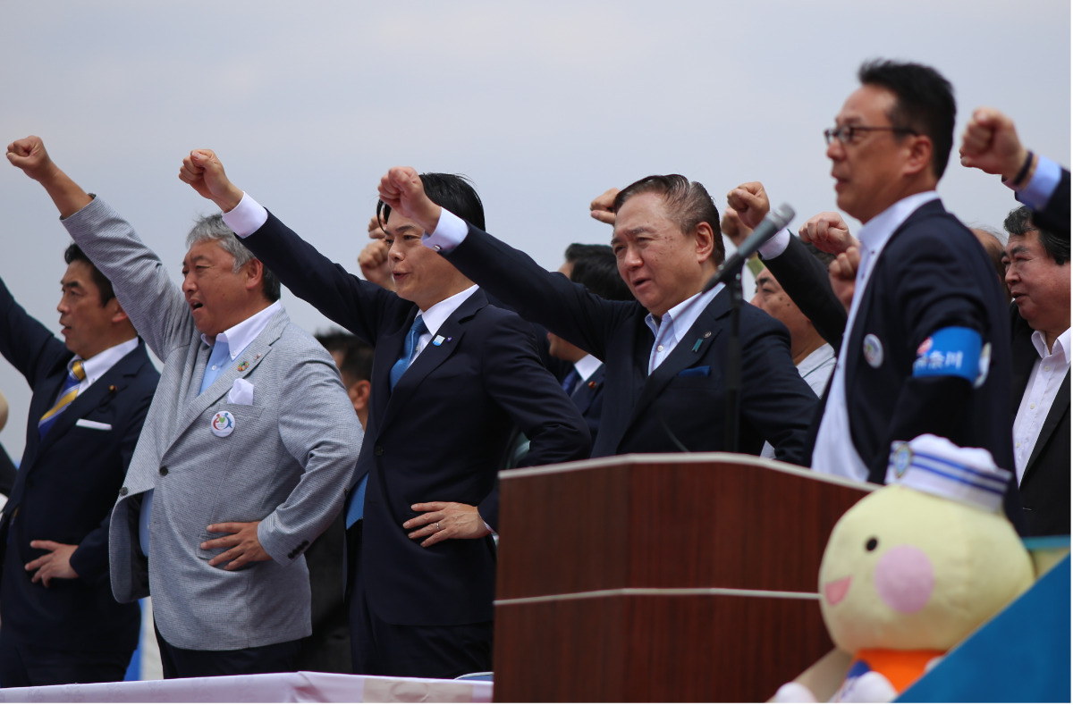 式典には黒岩祐治知事や山中竹春市長のほか、連合が支援する立憲民主党と国民民主党の国会議員や地方議員、公明党や社民党の議員も参加した。