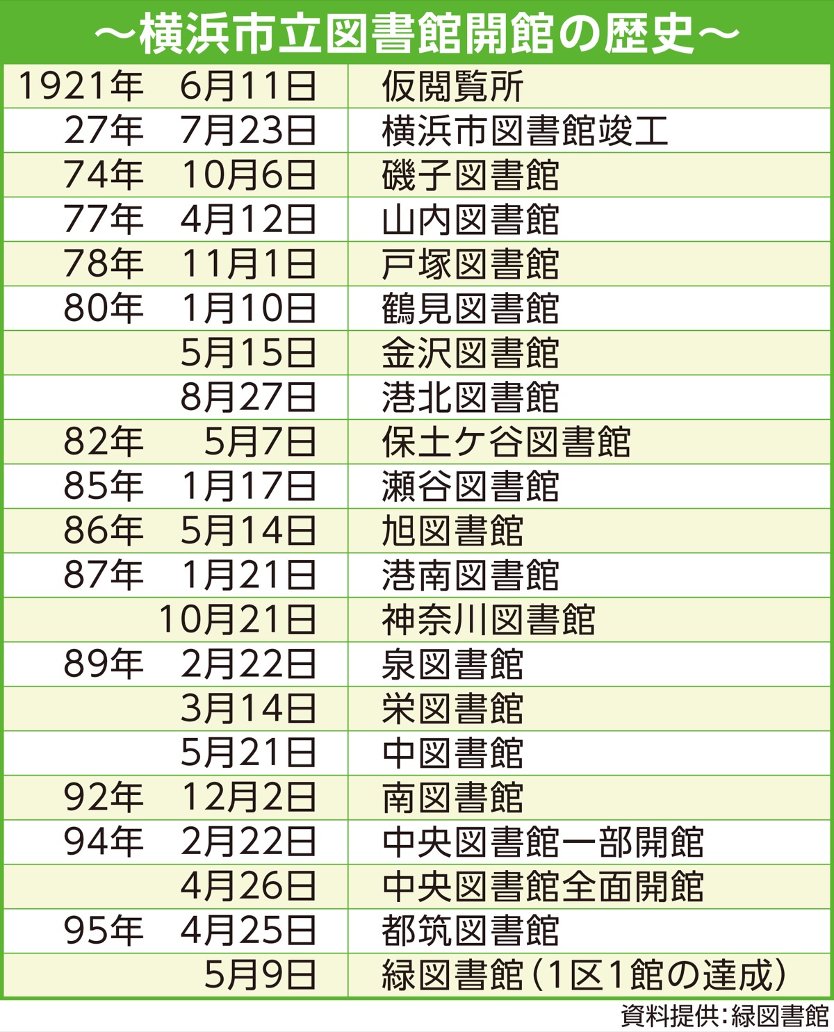 1927年、旧老松小学校跡(現在の中央図書館の場所)に横浜市図書館が竣工。戦中・戦後の激動を経て、1974年、2館目の市立図書館となる磯子図書館が開館した。これを皮切りに、約20年間で市内に次々と図書館が誕生。1995年、緑図書館の開館により「1区1館」の達成に至った。