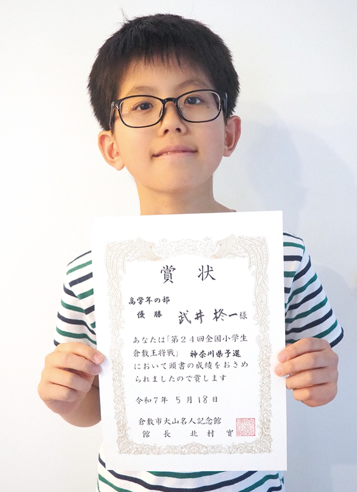 全国の小学生を対象にした将棋大会「倉敷王将戦」の神奈川県予選が5月18日に相模原市で開催され、十日市場小学校5年の武井柊一さんが高学年の部で初優勝を果たした。8月に岡山県倉敷市で開かれる本大会に神奈川県代表として出場する。
