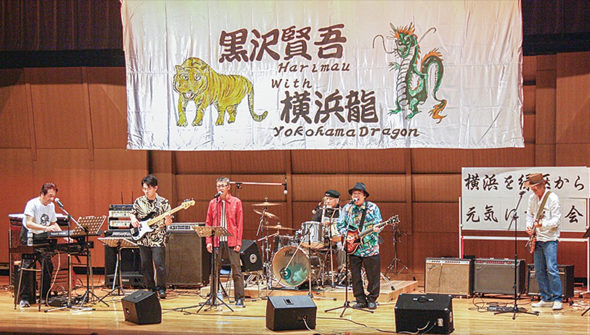 同会の加藤武代表がリーダーを務めるバンド「横浜龍(ドラゴン)」や、都筑区内にあるキッカケ学園の高等部のサウンドクラブなど5グループが出演。ゲストとして登場したロックバンド「ハリマオ」のギタリスト・黒沢賢吾さんが横浜龍のメンバーらと演奏を披露するなどし、会場を盛り上げた。