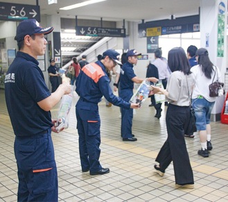 同署の署員や緑消防団員をはじめ、伊藤園、東急電鉄の社員約20人が参加。啓発用チラシのほか、伊藤園が用意した「健康ミネラルむぎ茶」480本などを配布した。