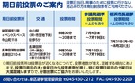 また、投票日当日、用事のために投票に行けない見込みの人は期日前投票の利用も可能(詳細は表に記載)。参議院選挙の期日前投票は7月4日(金)から、横浜市長選挙の期日前投票は7月21日(月・祝)から始まる。緑区選挙管理委員会は「投票日前日の土曜日は混雑することが予想されますので、分散投票にご協力を」と呼び掛けている。「投票のご案内」が届いていない、紛失したなどの問い合わせは緑区選管【電話】045・930・2212。