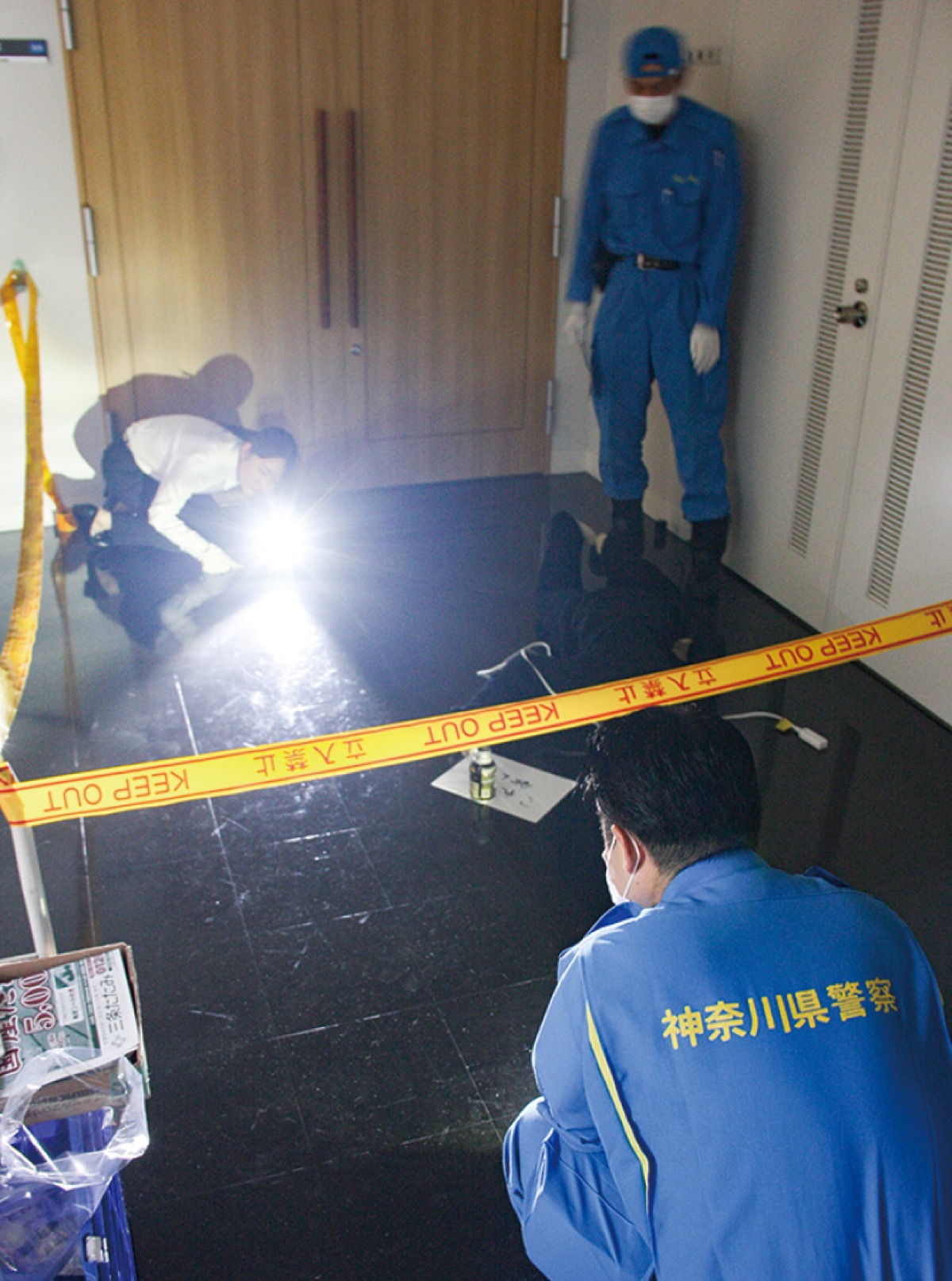 その後、参加者は鑑識活動の模擬体験を行った。事件現場に見立てた同署の廊下には、ダイイングメッセージを残したまま床に倒れている人形が1体。参加者は姿勢を低くして光を当てながら、床に残された足跡を探して粘着シートで採取した。