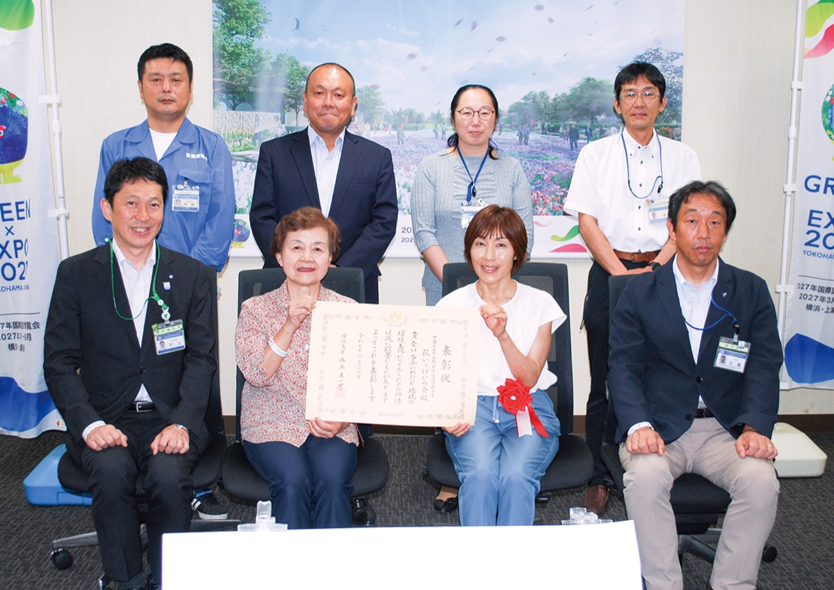 環境大臣による「地域環境美化功績者表彰」で6月、区内で長年活動する「中山中学校区 学校・家庭・地域連携事業 花いっぱいの会」(木原春子会長)が表彰を受けた。市内では同会を含め2団体が受賞。7月2日には緑区役所内で表彰状伝達式が行われ、佐藤康博区長らが木原会長らを祝福した。