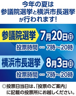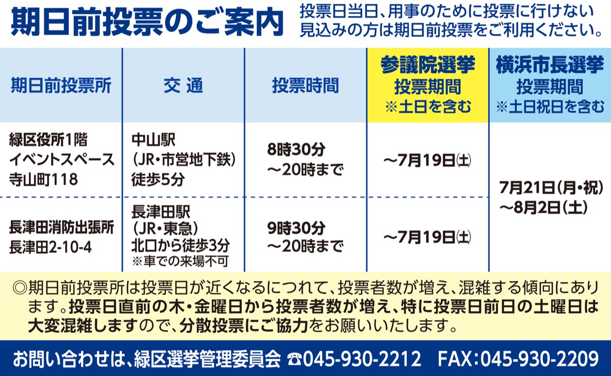 参議院選挙の投票日が今週末の7月20日(日)に迫っている。「当日投票に行けない人は期日前投票のご利用を」と緑区選管は呼び掛ける。