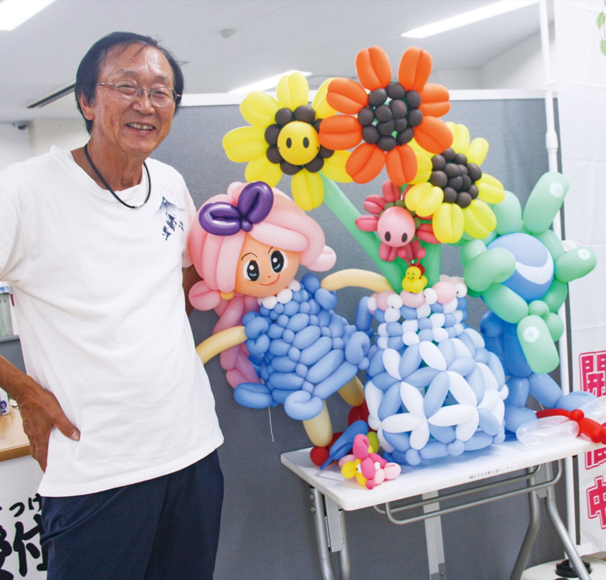 会場を彩ったのは花や動物、車などカラフルなバルーンアート作品の数々。「風船のハムちゃん」の愛称で親しまれるちょっと先生の端村良幸さんが制作した作品だ。会期中、工作やバルーンアートづくり、手品を習う体験などさまざまな講座が行われ、会場は多数の親子連れでにぎわった。
