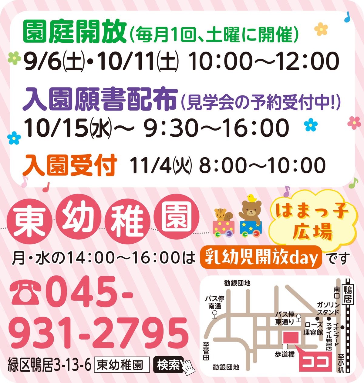 同園では現在、来年度に向けた園児を募集中。願書配布は10月15日(水)から。はまっ子広場設置や満3歳児受け入れなどで子育て支援を進める同園には毎年多くの応募があるため、早目の動き出しがカギとなる。