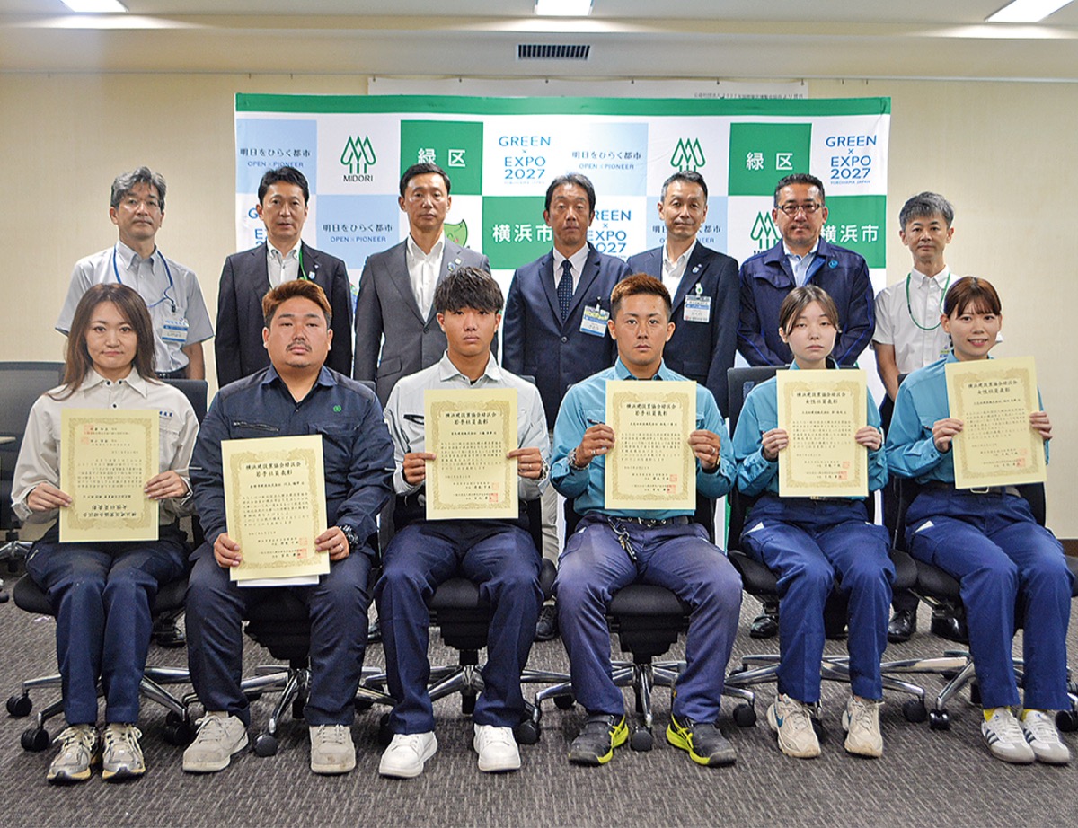 (一社)横浜建設業協会緑区会(宮内康治会長)が8月25日、緑区役所で「若手社員及び女性社員表彰式」を行った。これは、同区会構成会社の若手社員及び女性社員のうち、横浜市が発注した公共事業において、顕著な実績や成果をあげた技術者を表彰するもの。次世代を担う社員の技術や意欲向上を図り、横浜市における継続的な事業の向上を目指すことを目的としている。2021年度から続く制度で、今年度で5回目。