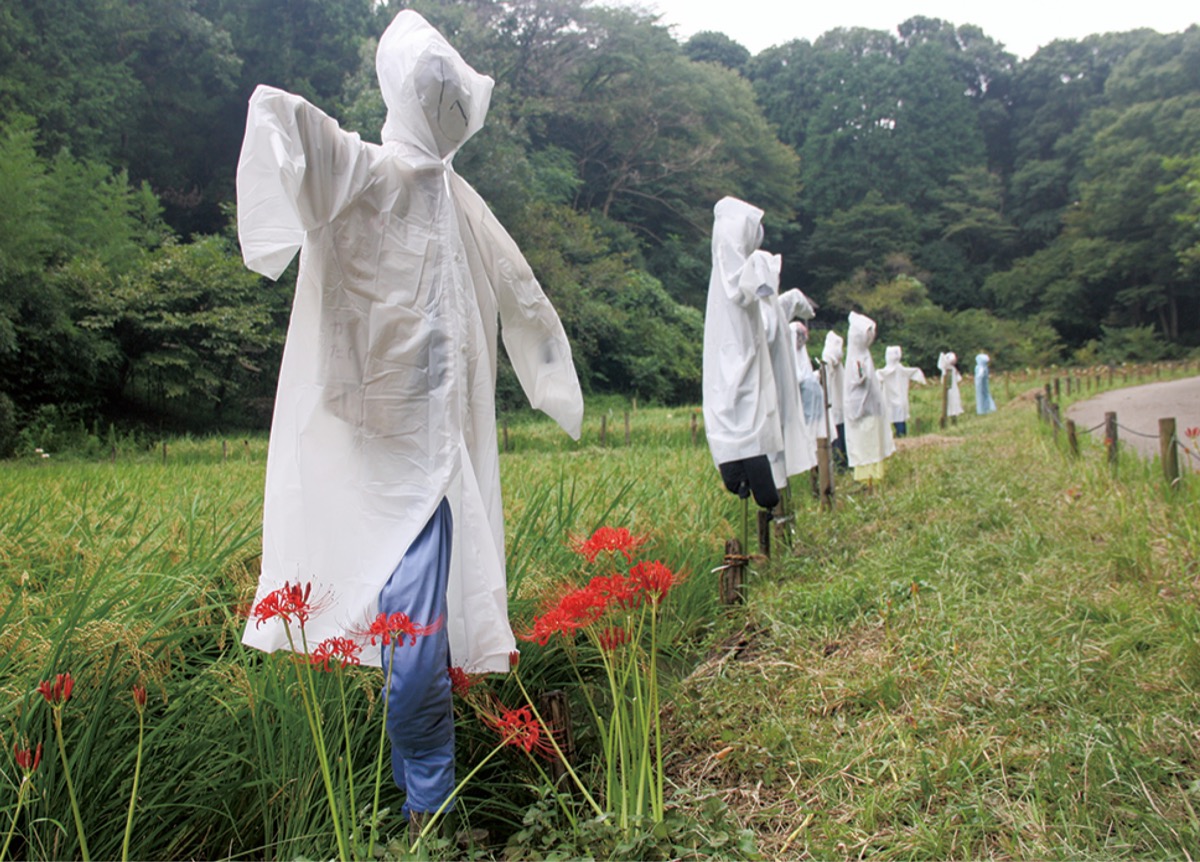 園内の東側に広がる水田のそばでは、赤や白の無数のヒガンバナが咲き、来園者の目を楽しませている。この水田では、地域の小学校の児童たちが稲作り体験学習として稲の栽培に取り組んでいる。9月19日、水田を訪れるといくつものかかしが立ち並び、その足元に咲くヒガンバナを見ることができた。