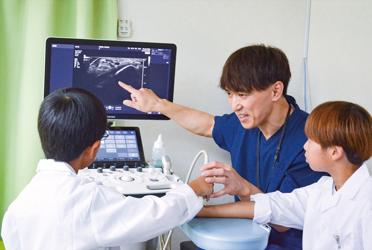 二宮整形外科皮フ科のプログラムには4人の小学生が参加。二宮研院長が自ら講師となり、一人ひとりに機械の使い方などを伝えた。超音波検査の機械を使った子どもたちは、リアルタイムで動く自分の体の血液や筋肉などを興味深く観察していた。このほか、ギプスシーネを付ける体験、ピンセットと持針器を使った縫合の体験なども行われた。参加者の一人、横尾望来(みらい)さん(4年)は「整形外科に興味があって参加した。2年前に骨折をしたとき、けがを直す先生が格好良いと思った。自分も医者になることを目指している」と話していた。