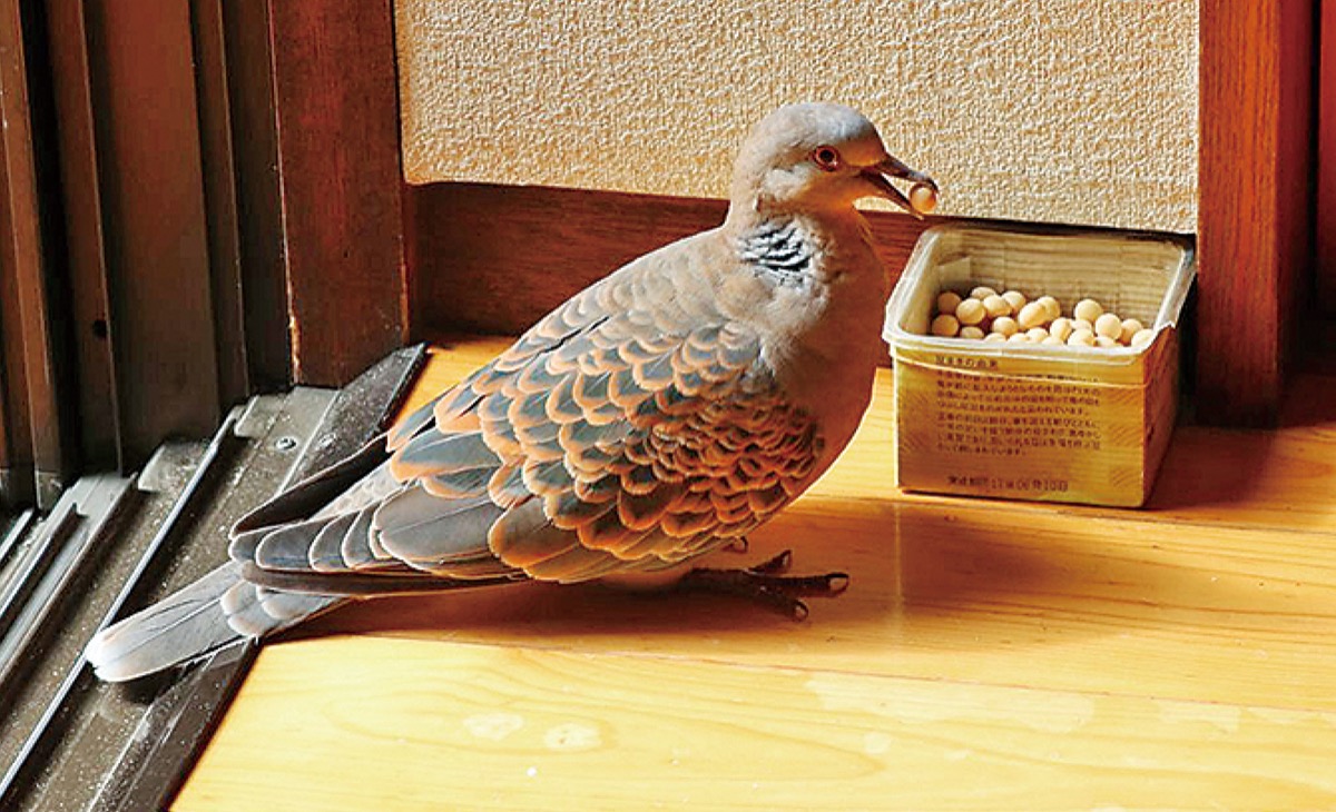 ヤマバトが高木さんの自宅に来るようになったのは5年ほど前のこと。「近くに巣があるのかな」と正康さん。「ここに家を建てたときは近くに川が流れていてもっと自然があった」。ヤマバトは名前の通り、かつては山にいる種だったが、近年では市街地でも見られる。「腹が減ると来るんだろうね。豆を切らしたらいけないから大変なんだ。けっこう高いんだよ」と、気まぐれな「お友達」のために日々世話を焼いている。