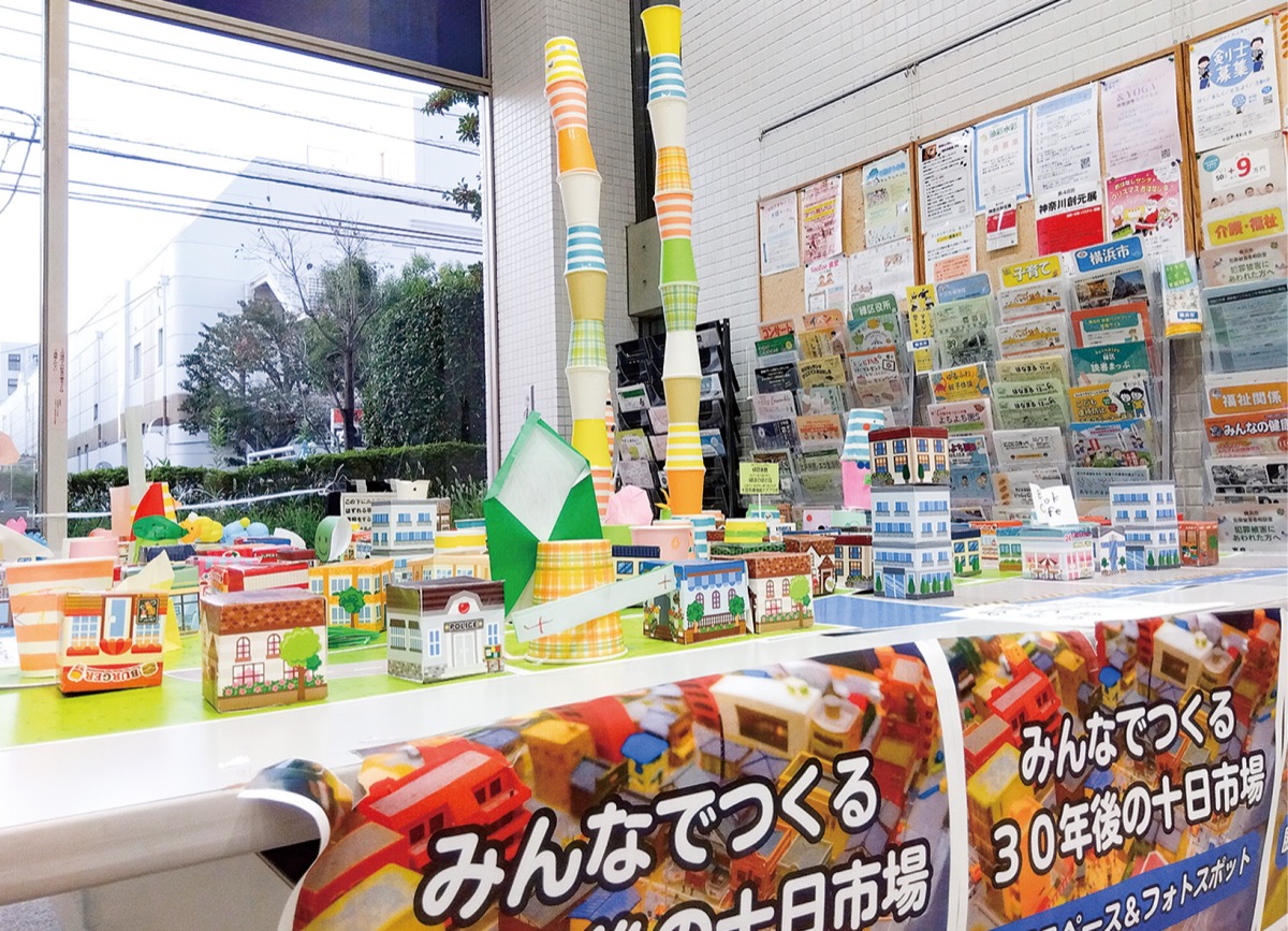 来場者が「あったらいいな」と思う店や施設などをペーパークラフトで制作し、30年後の十日市場町の姿を自由に創作するジオラマづくりにも、多くの親子が参加。完成したジオラマは、当面の間この施設の1階ロビーに展示するという。