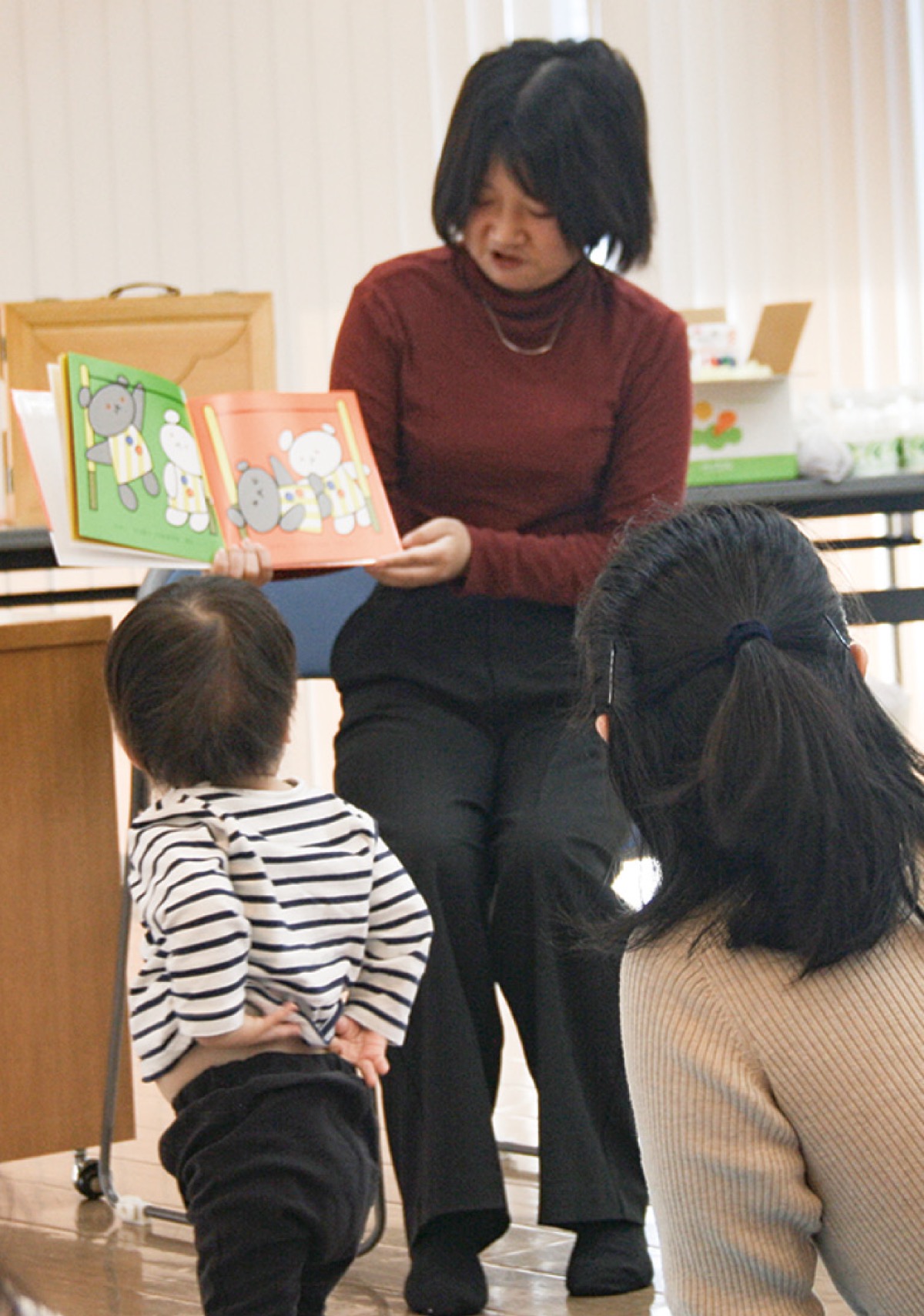 横浜創英大学の学生5人が絵本の読み聞かせやわらべ歌などで親子と交流を深めたほか、緑図書館のボランティアによる紙芝居の披露も行われた。紙芝居を見ていた5歳の男の子は「楽しかった。『おむすびころりん』が一番良かった」と話していた。
