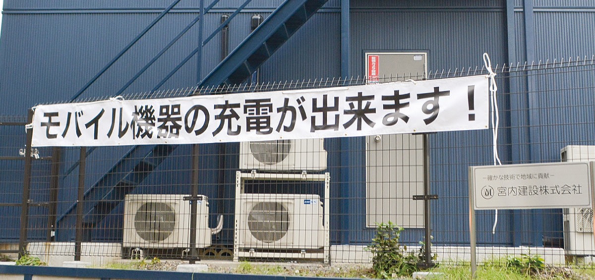 宮内建設株式会社(宮内康治代表取締役)が11月18日、災害時を想定した地域貢献の取り組みとして、モバイル機器仮設充電所設置訓練を実施した。