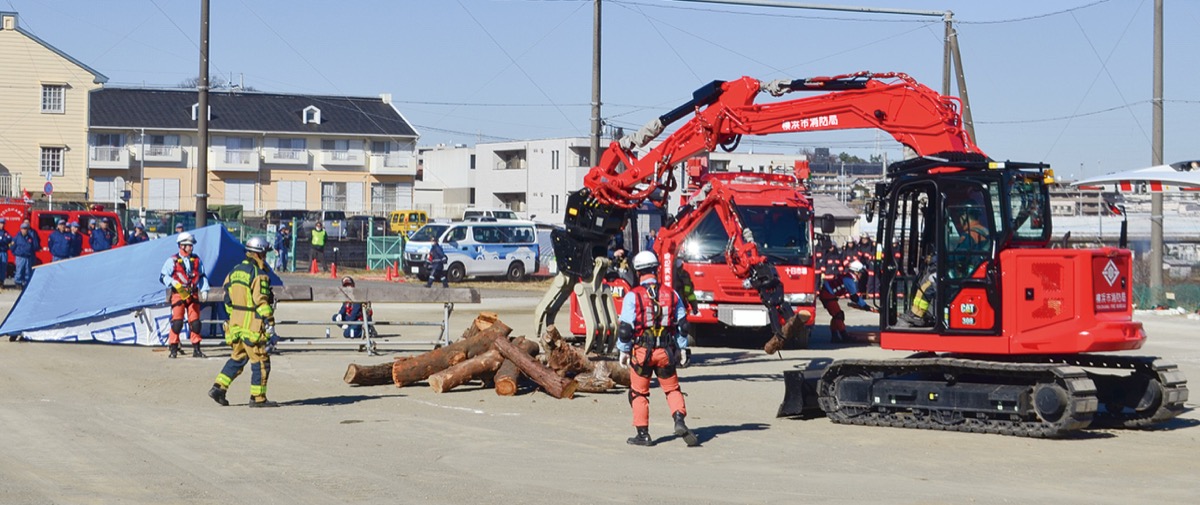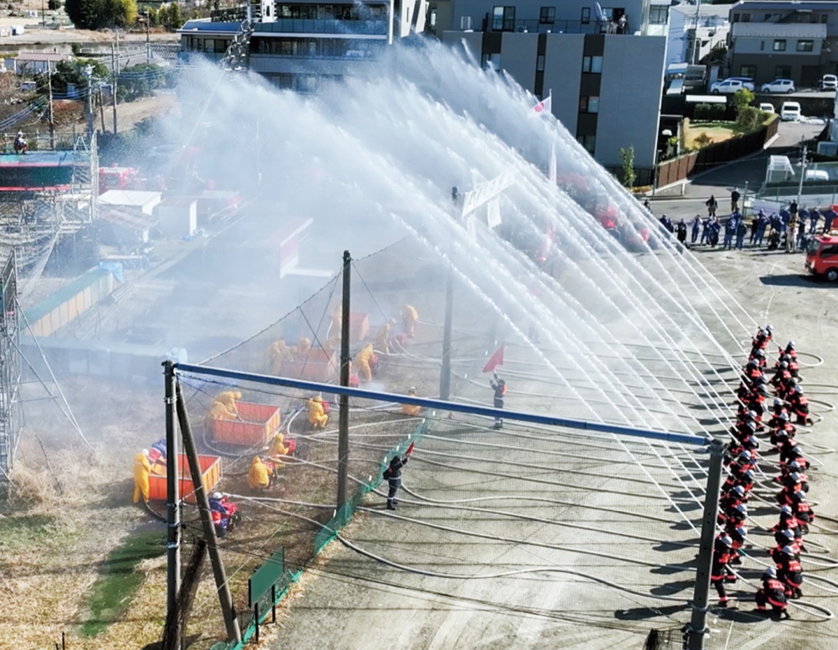 演技に移ると、神港鳶職組合が纏振り込みとはしご乗りを、緑消防団・消防署が震災を想定した訓練を披露。また、昨年11月の横浜市消防操法技術訓練会で活躍した「(株)DNPファインケミカル」や「医療法人社団 鴨居病院」、「緑消防団第二分団」らによる操法展示も行われた。最後は毎年恒例の一斉放水で締めくくった。