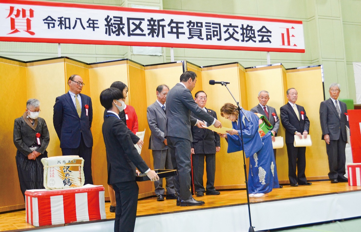 冒頭のあいさつで臼井委員長は「防犯や防災、まちの美化など、誰もが安心して暮らし続けられる緑区を目指して、日頃から活動している関係者や団体のおかげで今年も盛大に開催できた」と出席者に感謝を伝えた。続いて、山中竹春市長のメッセージを佐藤康博区長が代読。来年3月に横浜で開催されるGREEN×EXPOに向け「市民の皆さまと一緒に創り上げていきたい」と呼び掛けた。佐藤区長は緑区出身の高校生2人がプロ野球チームから指名を受けたことや、十日市場中出身の力士が十両に復帰したことなどスポーツ選手の昨年の活躍に触れ「本年も緑区にゆかりある方々がさまざまな分野で活躍される姿を期待している」と話した。