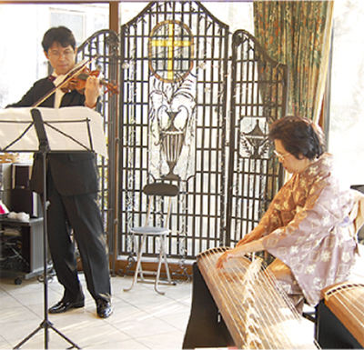 普段はクラシックのコンサートを開催する同サロンだが、今回は邦楽がメインテーマ。曲目のひとつ「春の海」では、区内在住の箏(こと)奏者・三上園東巳(そのとみ)さんと同サロンの主任講師でヴァイオリニストの大宅一哉さんが共演。原曲の尺八パートをヴァイオリンで演奏し、見事な調和で聴衆を魅了していた。