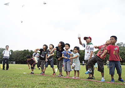 地域の大学生や中高生ボランティアの協力を得ながら、子どもたちが手製の紙飛行機を飛ばす「ひこうきとばそう大会」が先ごろ、岸根公園で行われた。主催はNPO法人あいあい。