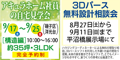 さらに、同展示場では特別企画「社員の家づくり」も開催。9月17日(土)から25日(日)の9日間、磯子区洋光台の約35坪、3LDKの構造も公開。3Dパースソフトを使用した外観や内装、間取りの無料相談も好評。