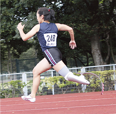高桑さんが義足を使い始めたのは中学1年生の時。足の骨肉腫(骨のがん)のため、左足膝下の切断を迫られたのだ。切らずに生活する方法もあったが、当時行っていたテニスなど『運動したい』との思いからの決断だった。「まだ幼かったので『わけ分からずに』が本音。でも、後悔したことは一度もありません。義足を作って頂いている方に陸上を紹介してもらい、一生懸命取り組めることにも出会えました」と笑顔を見せる。
