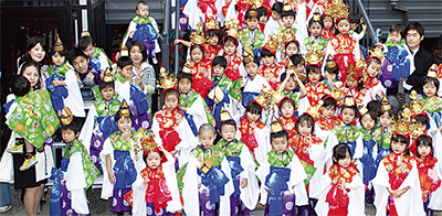 菊名神社で先ごろ、子どもの成長を祈る「稚児行列」が行われ、周辺地区の幼稚園児ら100人を超える子どもたちが集まった。同社の社殿改修、客殿新築記念として15年ぶりの行列となった。参加した子どもは、「一生涯幸せになる」と古来から言い伝えられているという。