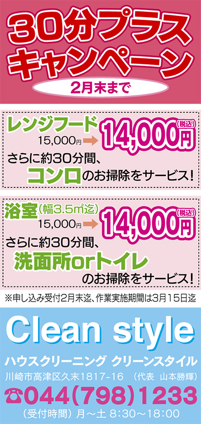 ハウスクリーニングのプロ「クリーンスタイル」では、「30分プラスキャンペーン」を実施中!普段の丁寧な仕事に加え、ちょっとした汚れが気になる所の掃除をプラスして依頼できるお得なキャンペーン。