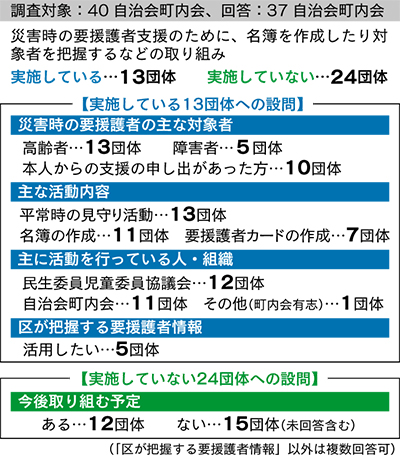 区は、今回「実施している」と回答した13団体も含めると区内の約82%がこの事業に取り組んでいると指摘。区担当者は「地域によっても担い手が不足していたり、要援護者の対象になる人がいないなど、実状は様々。今後は一緒に課題を考えていければ」と話す。