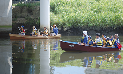 鶴見川がかつて「舟運」と呼ばれ、舟で様々なものを運搬する大動脈であったことを伝えていく活動を、新羽小の「土曜塾」という課外授業の中で行ったもの。当日は同プロジェクトのメンバーのほか、約40人の児童らが参加。子どもたちは最初はおそるおそる舟に乗り込んでいたが、慣れると、懸命に舟を漕ぎながら乗船体験を楽しんでいた。