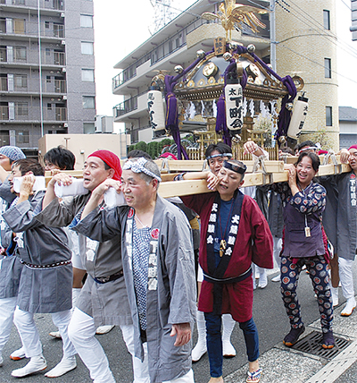 太尾神社例大祭が先ごろ行われ、太尾地区連合町会(飯山精三会長)の10町会それぞれの神輿が、威勢のよい掛け声とともに商店街や大倉山駅前などを巡行した。子どもたちも山車を引きながら、元気よく街を練り歩き、盛り上がりを見せた。