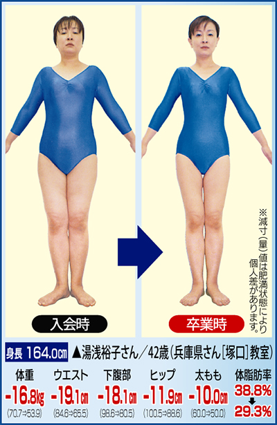 厚着でますます目立つ”ポッコリお腹”を引っ込めたかった湯浅裕子さんは、「特殊特急マシン」も活用して、思った以上に早くお腹の18・1cm減寸を達成。脂肪の落ちにくい太ももの10cm減寸まで、16・8kgの減量と同時に実現した湯浅さんは、「落としたかった脂肪が落ちて、ボディにめりはりが戻った」と大満足。