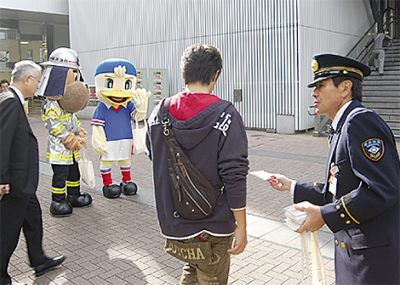 9日からきょうまで行われる「秋の火災予防運動」。港北消防署は横浜F・マリノスと協同で、火災予防の広報活動を展開している。