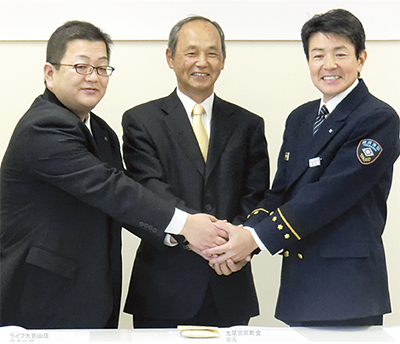 ライフ大倉山店と太尾宮前町会(秋本健一会長)、港北消防署(坂本浩署長)が16日、「消防応援協力に関する覚書」を締結した。