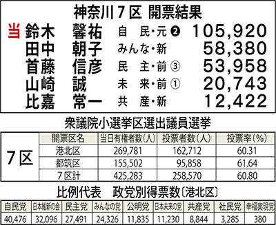 第46回衆議院選挙で神奈川7区(港北区・都筑区)は、自民党公認の鈴木馨祐氏が10万5920票を獲得し、勝利した。民主党公認の首藤信彦氏は重複した比例区でも当選できなかった。みんなの党公認の田中朝子氏、日本未来の党公認の山崎誠氏、共産党公認の比嘉常一氏も及ばなかった。