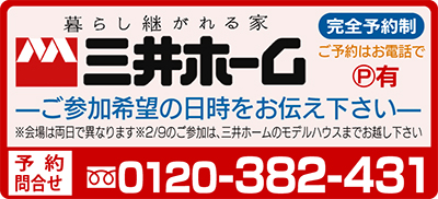 ツーバイフォー住宅のパイオニア・三井ホーム(株)では”住まいに運気を引き寄せる”と題し、風水・家相の個別相談会を2月9日(土)と10日(日)に行う。時間は午前10時から午後6時まで、相談時間は1組最大90分間。参加無料で完全予約制(限定14組)。申込みは電話で。なお同相談会は毎回好評のため、希望の人は早めに問合せを。