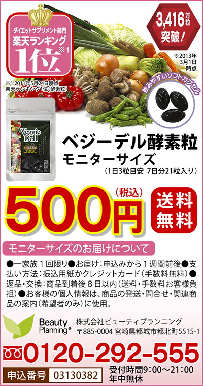 キレイを企画する会社、(株)ビューティプランニング(宮崎県都城市)の「ベジーデル酵素粒」が本紙初登場。これまでに、3400万粒以上を販売。人気ショッピングサイト楽天の、ダイエット・サプリメント部門で、売上1位(2011年5月時点)の実績を誇る。