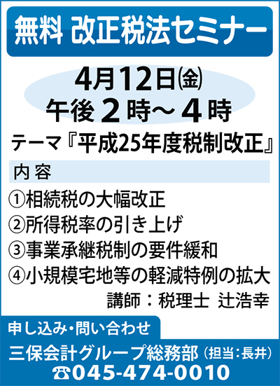 同グループでは4月12日(金)、平成25年度税制改正をテーマとした『改正税法セミナー』を開催する。定員40人で参加費無料(事前予約制)。今後の税制改正の方向性や留意点、具体的な対応策などが、同グループ所属の税理士によってアドバイスされる。