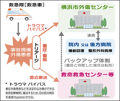 横浜市外傷センターは市の外傷診療の拠点として、交通事故や多発外傷などの重症外傷患者の救急搬送を集中的に受け入れる。