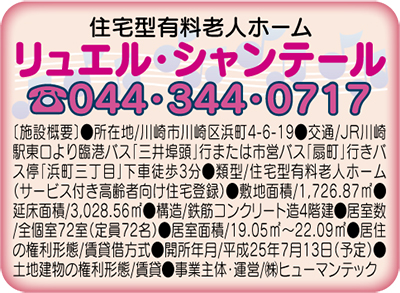 音楽療法を中心としたデイサービス「シャンテール」を横浜地区で展開している(株)ヒューマンテック。同社がこの7月に川崎にオープンさせるのが「住宅型有料老人ホーム リュエル・シャンテール」(全72室)だ。5月4日に行われた内覧会は盛況で、すでに数組の申込みを受けているとのこと。