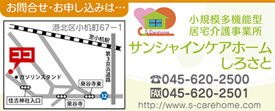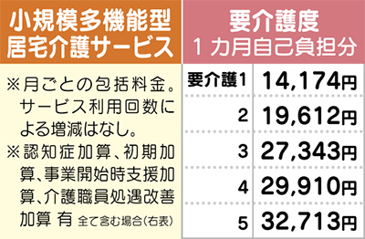 横浜市民で介護保険認定者であれば、介護度により、一定の自己負担額(=表参照)で様々なサービスが受けられる、小規模多機能型居宅介護事業。先月上旬、小机町にオープンした『サンシャインケアホームしろさと』は、同事業の下、多彩なサービスを展開し、好評を得ている。