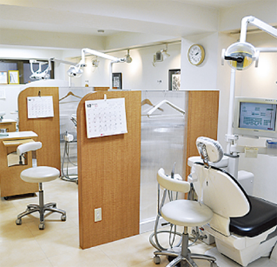 同院では、患者への身体的・時間的負担をより軽くするため、デジタルレントゲンを採用。少ない被爆量で鮮明な画像が撮影でき、瞬時に各診察台のモニターに表示できるという。またキッズルームも併設。