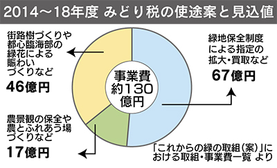 また、これまで実施していた赤字法人に対する免税措置が廃止されることも決まった。これは、リーマンショック後の例外的な措置であり、緑の保全・創造による受益は、個人・法人に広くおよぶとの理由からだ。これにより、5年度分の税収約105億円(法人の納付年度ずれにより実際は約99億円見込)に対し、14年度からの5年度分は25億円増の約130億円と見積る。