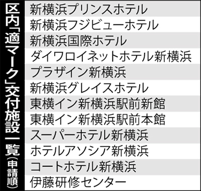 横浜市は、地上3階以上で30人以上を収容するホテルや旅館などを対象に、消防法令などに適合していることを証明する「適マーク」の交付を9月下旬から各消防署で実施した。港北消防署は9月24日に式を行い、12施設(=左下表)に交付した。市内では24施設の中区に続き、2番目に多い数だ。運用は10月1日から開始されている。