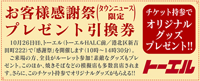 同社は、日ごろのご愛顧に感謝して10月26日(日)、「お客様感謝祭」を開催する(=表参照)。雨天決行。当日は、フード&ドリンクなども楽しめるほか、大道芸・お買い得な即売会などイベント盛りだくさん。水素水の試飲も行う(入場無料)。
