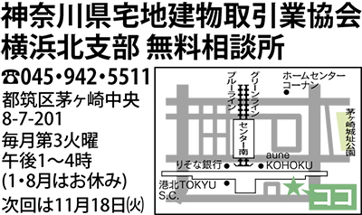 (公社)神奈川県宅地建物取引業協会横浜北支部が毎月第3火曜日に開設する不動産無料相談所。次回は11月18日(火)の午後1時〜4時。土地や家に関する疑問や悩みを、宅建協会に所属する”不動産のプロ”が無料で対応。相談希望は電話予約または直接会場へ。